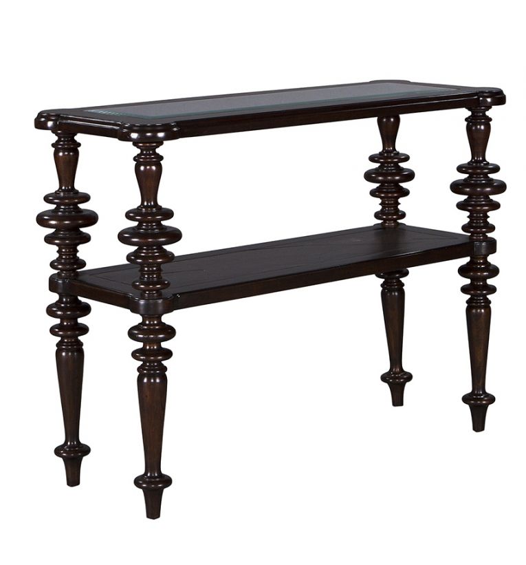 A unique a decorative wooden glazed console table with shelf.  The modern Bella Donna furniture collection is made from melia ash that is finished in a rich, burnished chestnut brown. Features a glass table top.