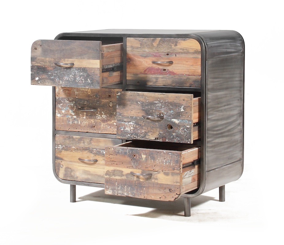 An urban living upcycled furniture collection.  Our industrial style Brooklyn finest 6 drawer chest is constructed from a metal frame and reclaimed boat timbers complete with markings of the paint or etchings of their previous use, making each piece unique and interesting. With strong real steel detailing this loft style living range is perfect for the most design led home.