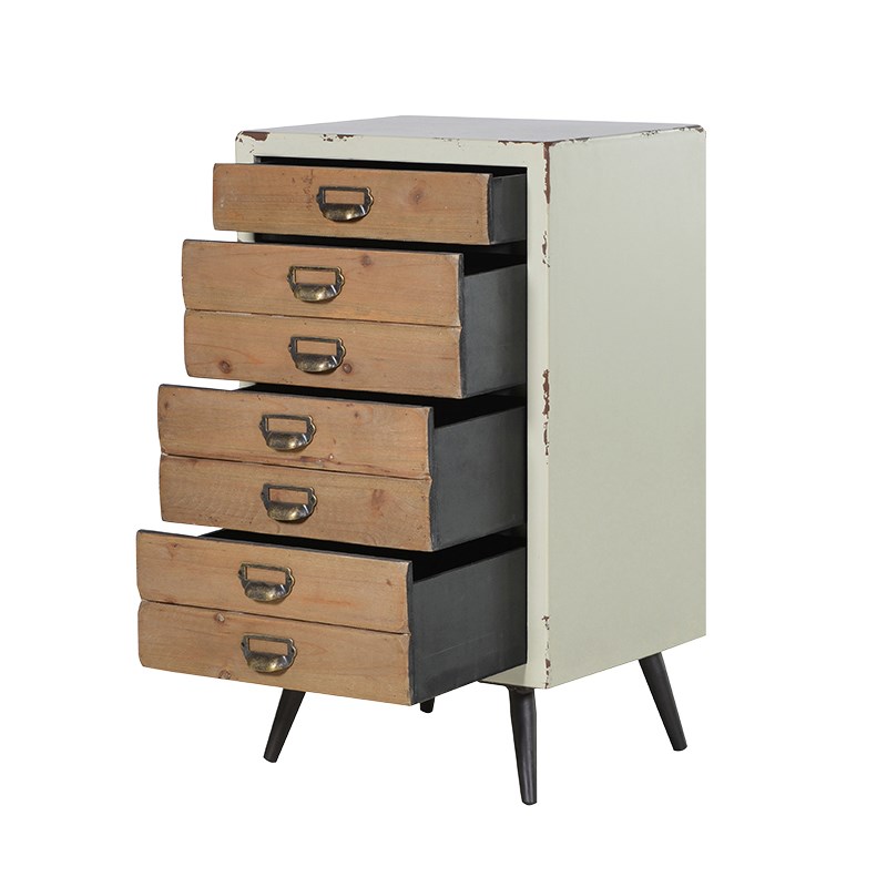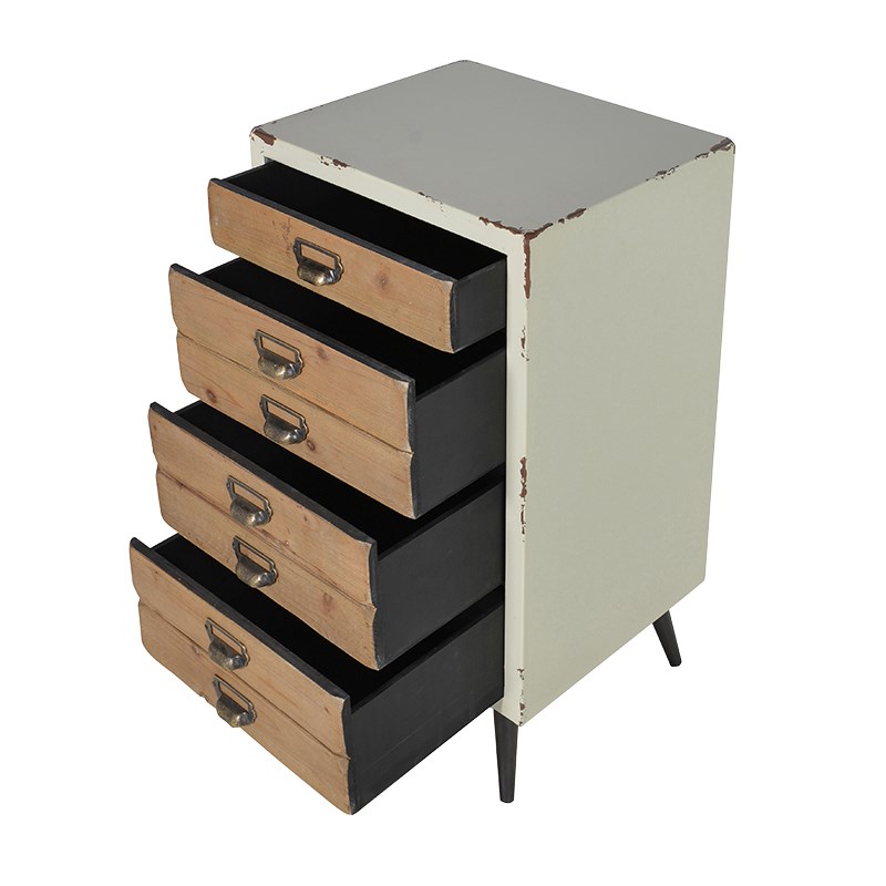 A small aged industrial chic style chest featuring false drawers. Perfect for a lounge or bedroom.
