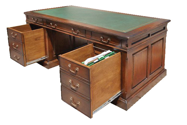 A stunning period antique style desk, featuring a green leather top and paneled drawers and sides. Top quality solid brass hardware compliments this top class desk.