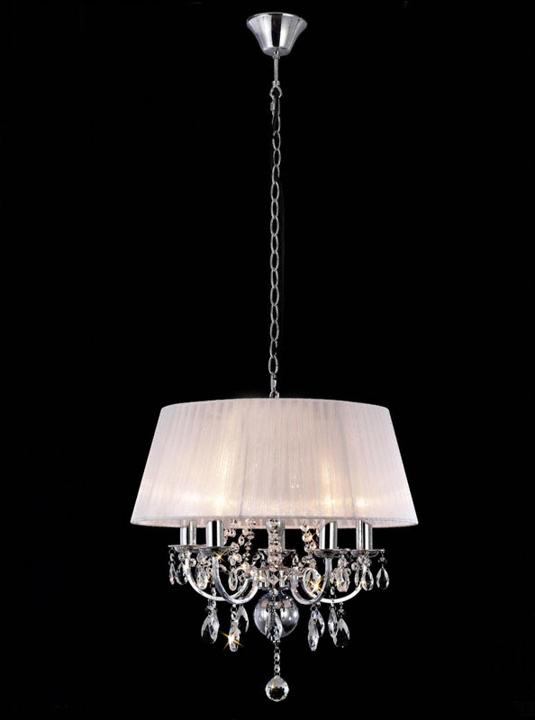 Our beautiful Madmoiselle white shaded chandelier pendant will add a touch of glamour to any room!  The fabric voile shade allows maximum light output with an ambient feel.