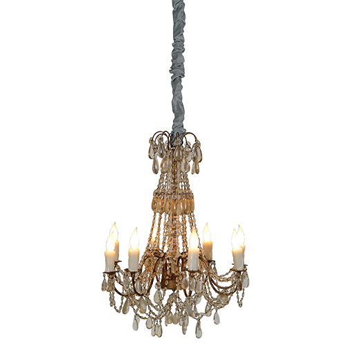 A stunning French style chandelier with Opaque crystals and beading. The ultimate shabby chic chandelier for a boudoir or fancy styled room. Adorned with chunky glass droplets.