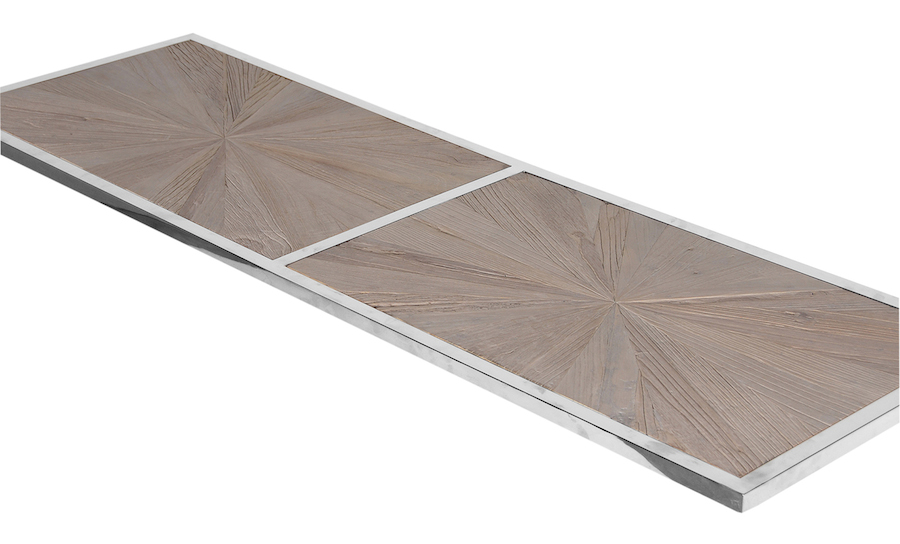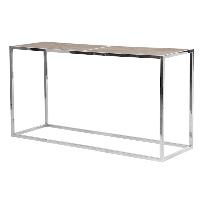 A chic metal console table with a rustic parquet style table top. Our modern parquetry console table will look fabulous is a contemporary or industrial chic styled setting.