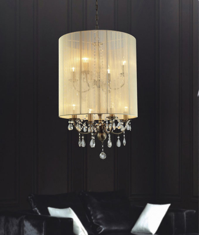 Our Plush chandelier is a substantial 2 tier crystal chandelier encased in a silk string cylinder shade.  The nature of the shade removes the harshness of the lamps yet is transparent enough to appreciate the details and quality of the chandelier within.  The bottom arrangement of Asfour crystal is exposed thus giving a special combination on the simplicity of the shade yet the intricate detail of a crystal chandelier.