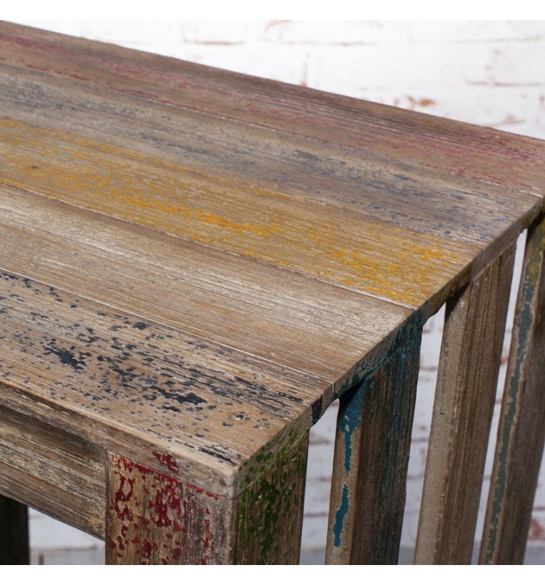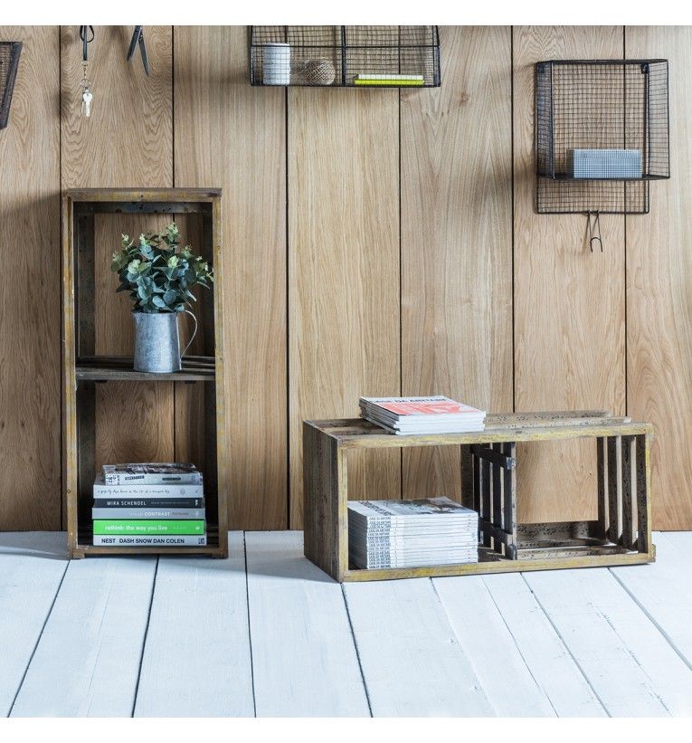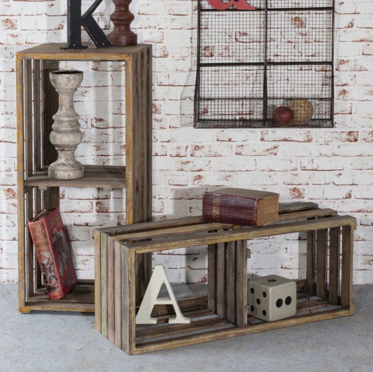 A set of 2 vintage industrial wooden crate shelves that are great for storing decorative pieces and well as many other day to day items. A great way to add a subtle industrial look to a room.